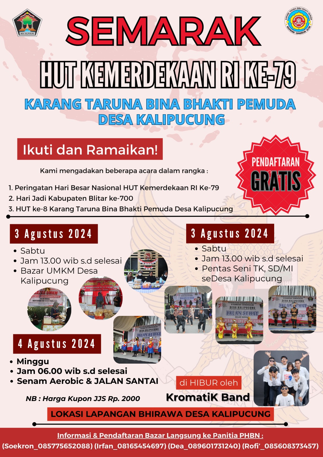Dalam rangka memperingati beberapa momen penting, yaitu HUT Kemerdekaan Republik Indonesia yang ke-79, Hari Jadi Kabupaten Blitar yang ke-700, dan HUT ke-8 Karang Taruna Bhina Bakti Pemuda Desa Kalipucung, Pemerintah Desa Kalipucung bersama Karang Taruna Bhina Bakti Pemuda akan menyelenggarakan serangkaian kegiatan yang menarik di Lapangan Bhirawa, Desa Kalipucung. Berikut adalah agenda kegiatan yang telah disiapkan: