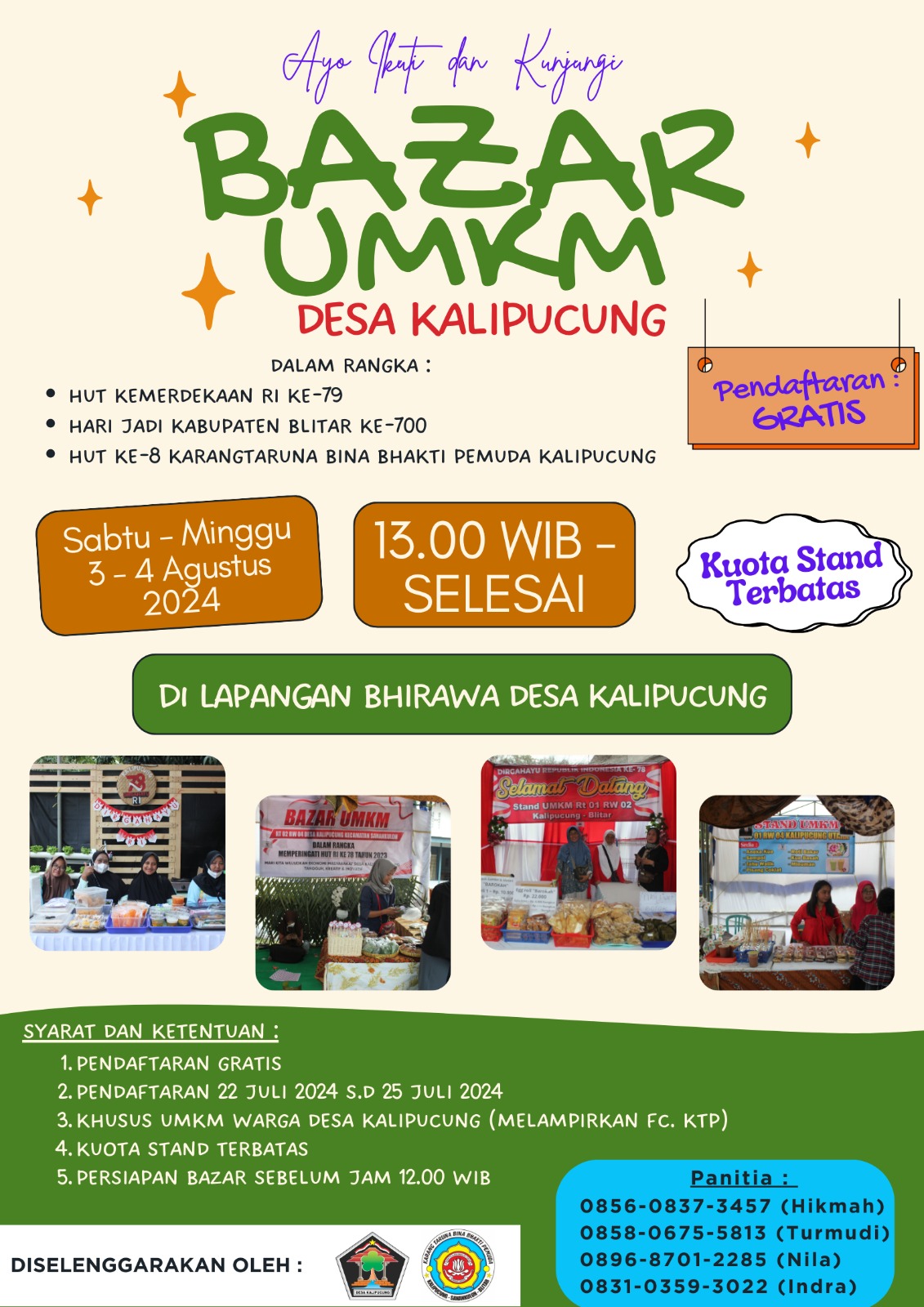 Mari kita rayakan HUT Kemerdekaan RI, Hari Jadi Kabupaten Blitar, dan HUT Karang Taruna Bina Bhakti Pemuda dengan semangat kebersamaan dan mendukung perekonomian lokal. Warga Desa Kalipucung diundang untuk ikut serta dalam Bazar UMKM ini. Jangan lewatkan kesempatan untuk memamerkan produk unggulan UMKM Anda dan berinteraksi dengan sesama warga.