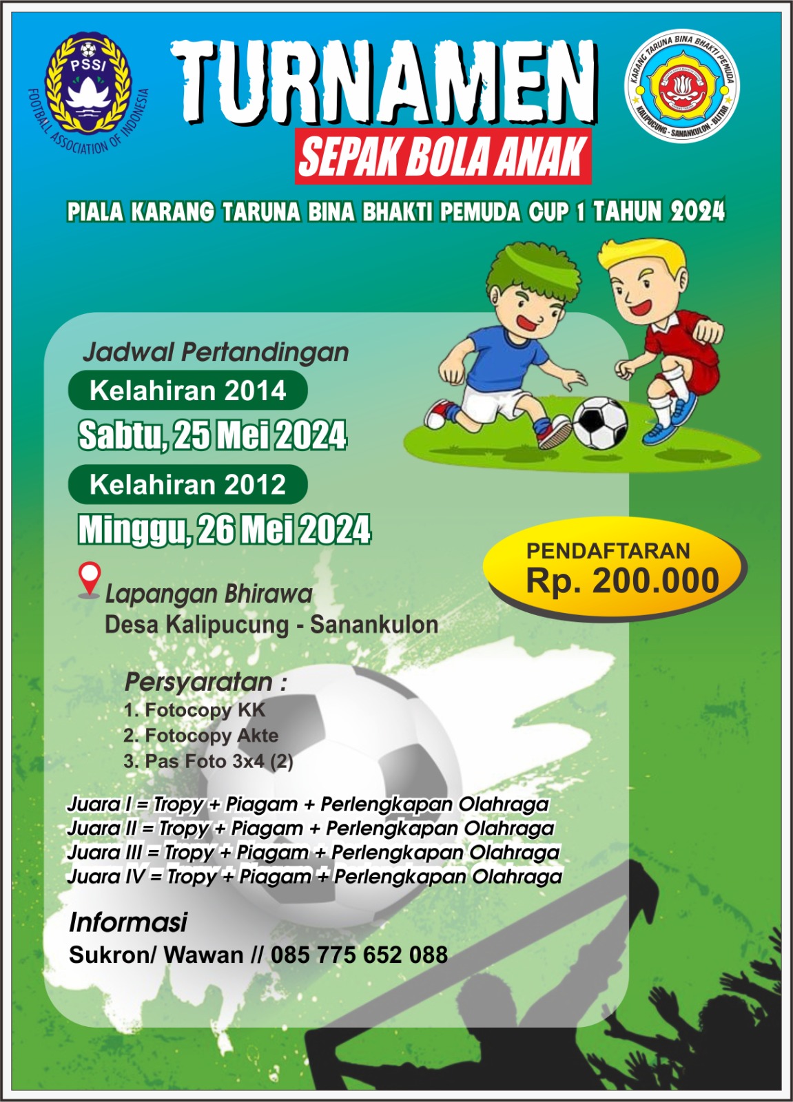 Mari dukung semangat dan bakat anak-anak kita dalam Turnamen Sepak Bola Anak Piala Karang Taruna Bina Bhakti Pemuda CUP 1 Tahun 2024! Sampai jumpa di lapangan!